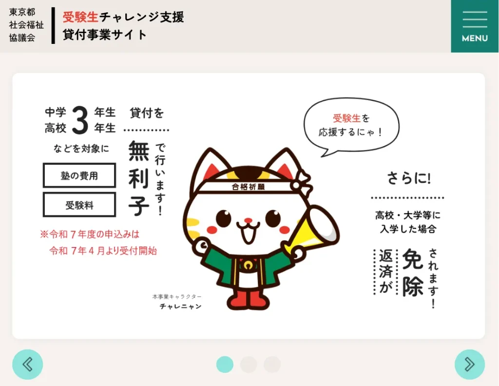 | 受験生チャレンジ支援貸付事業 | 東京都 | 学習塾等受講料:上限30万円 高校受験料:上限2万7,400円 大学受験料:上限12万円 |